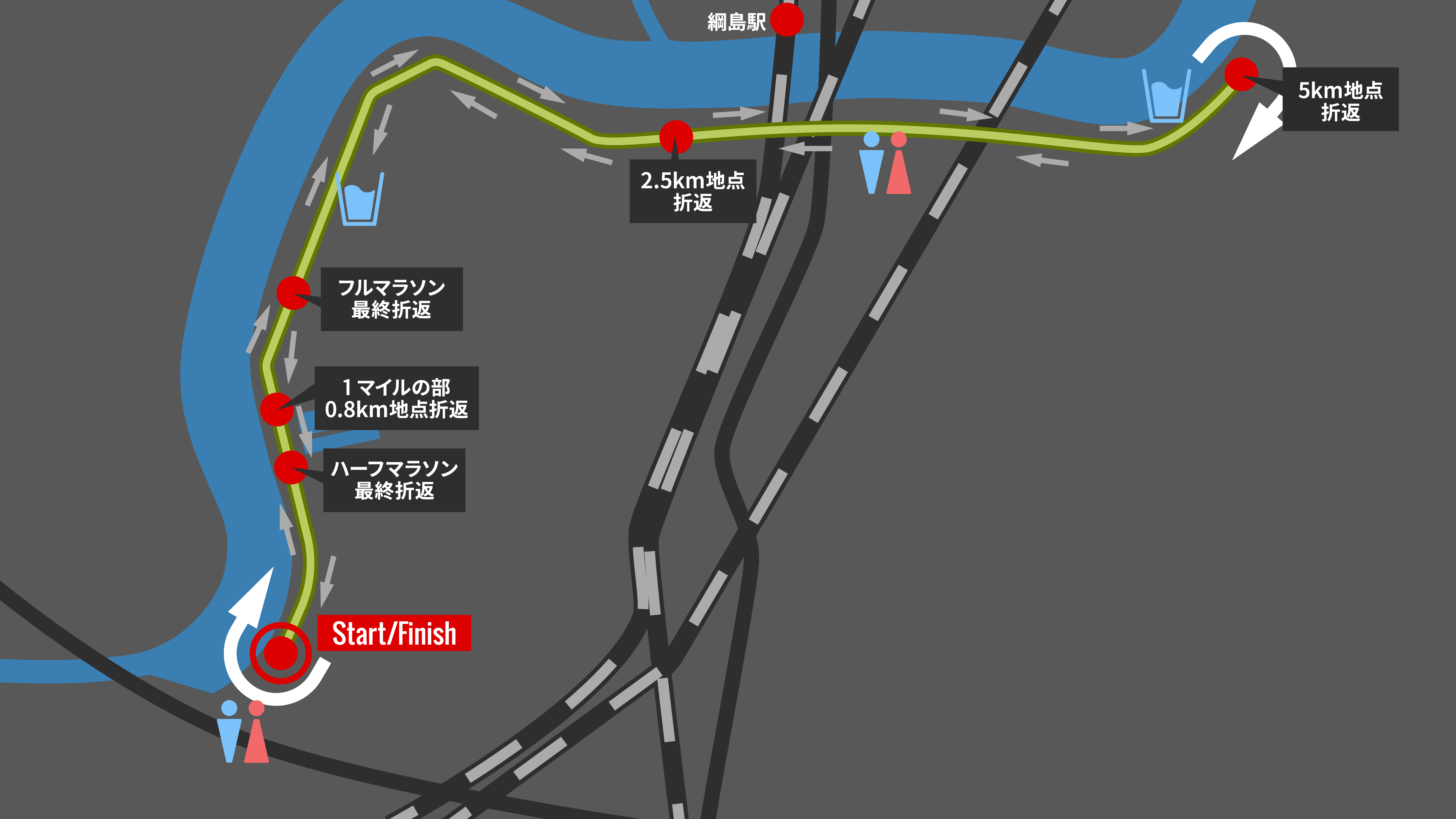 | ●注意事項 | 本大会は河川敷をコースとして使用します。一般の方の通行もあるため、安全面を考慮し、以下のルールを遵守してください。 ・ペーサーグループでの走行の有無に関わらず、原則片側2列以内での走行とします。また一部道幅の狭い箇所は1列走行とします。1列走行の箇所に関しては、ホームページ内のコースマップにてご確認ください。 ・イヤフォンの着用は周囲からのアナウンスが聞き取れない可能性がございますので原則着用を禁止とします。 ・カメラ等の携行品を手で持っての走行を禁止とします。 ・コース内もしくはコース脇での伴走及び給水補助等の行為 上記のルールを遵守していないと大会運営者が判断した場合、該当する参加者への注意ならびに参加取りやめ、大会開催中については失格処分とする場合がありますので予めご了承ください。 |